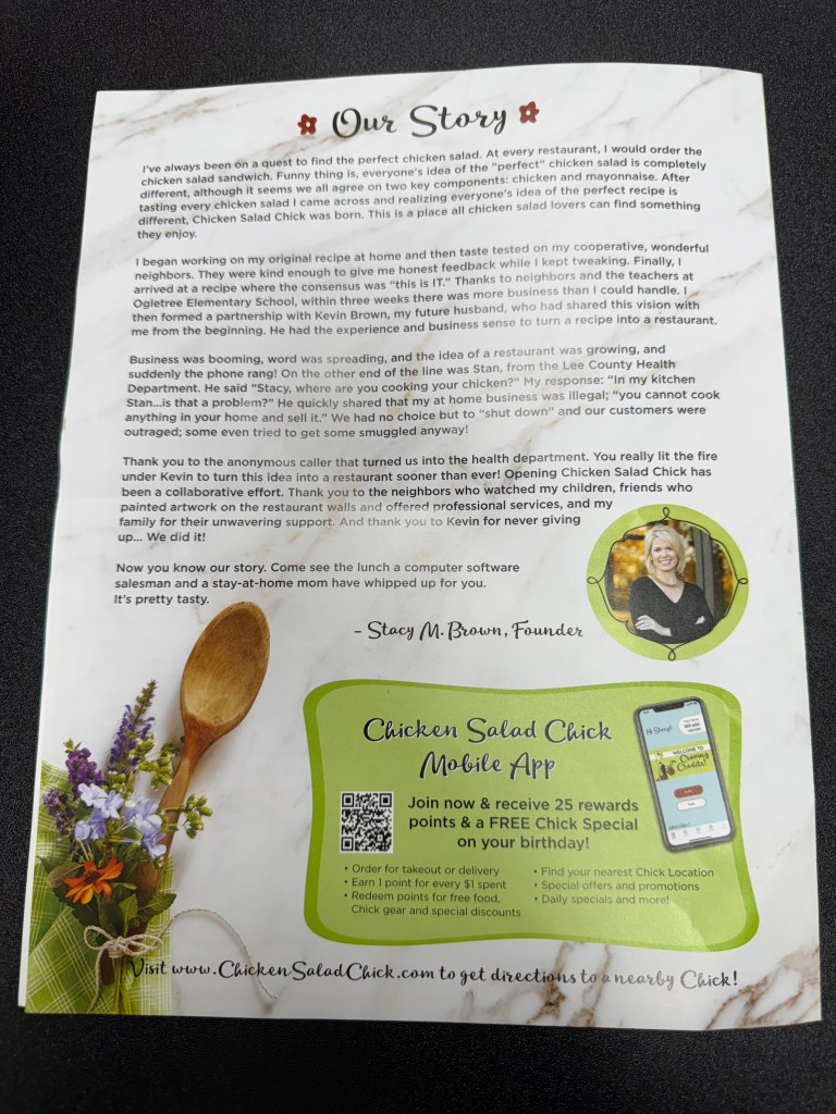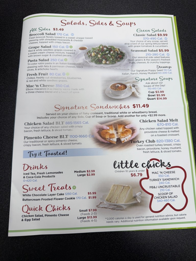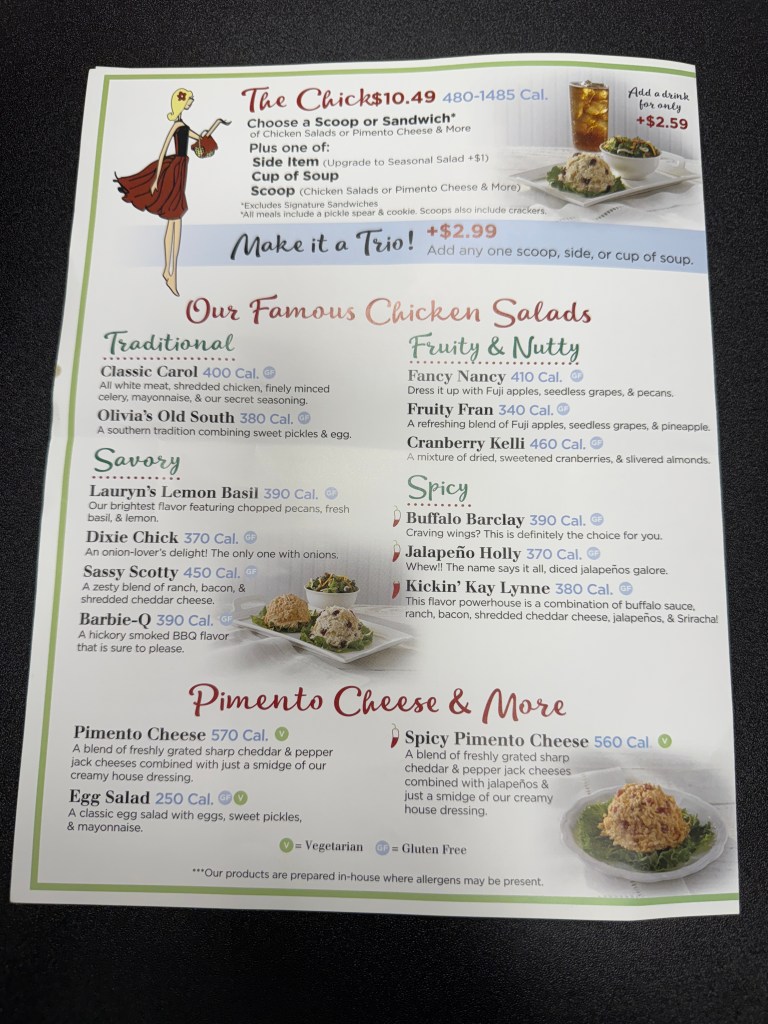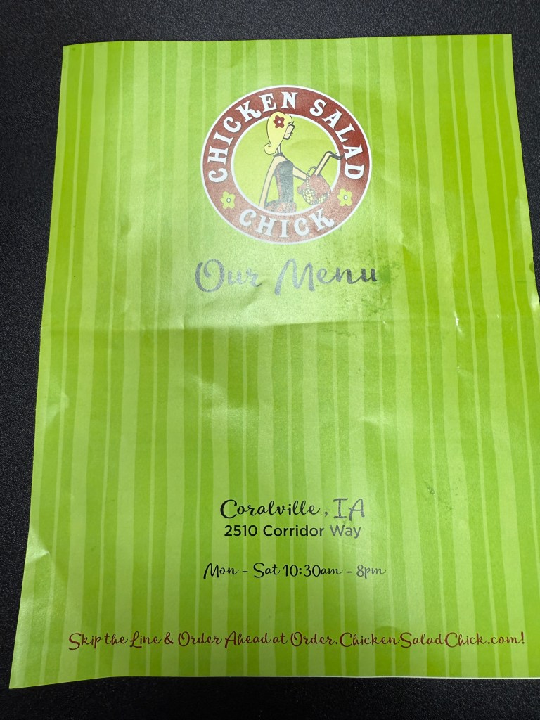 If you’ve never been to Chicken Salad Chick, do yourself a favor and go. There is one in Coralville, Iowa. I have included photos of the menu and the address. Whether you’re a devoted chicken salad fan or a curious skeptic, you’ll find something to love. Go for the food, stay for the ambiance, and leave with a smile.
